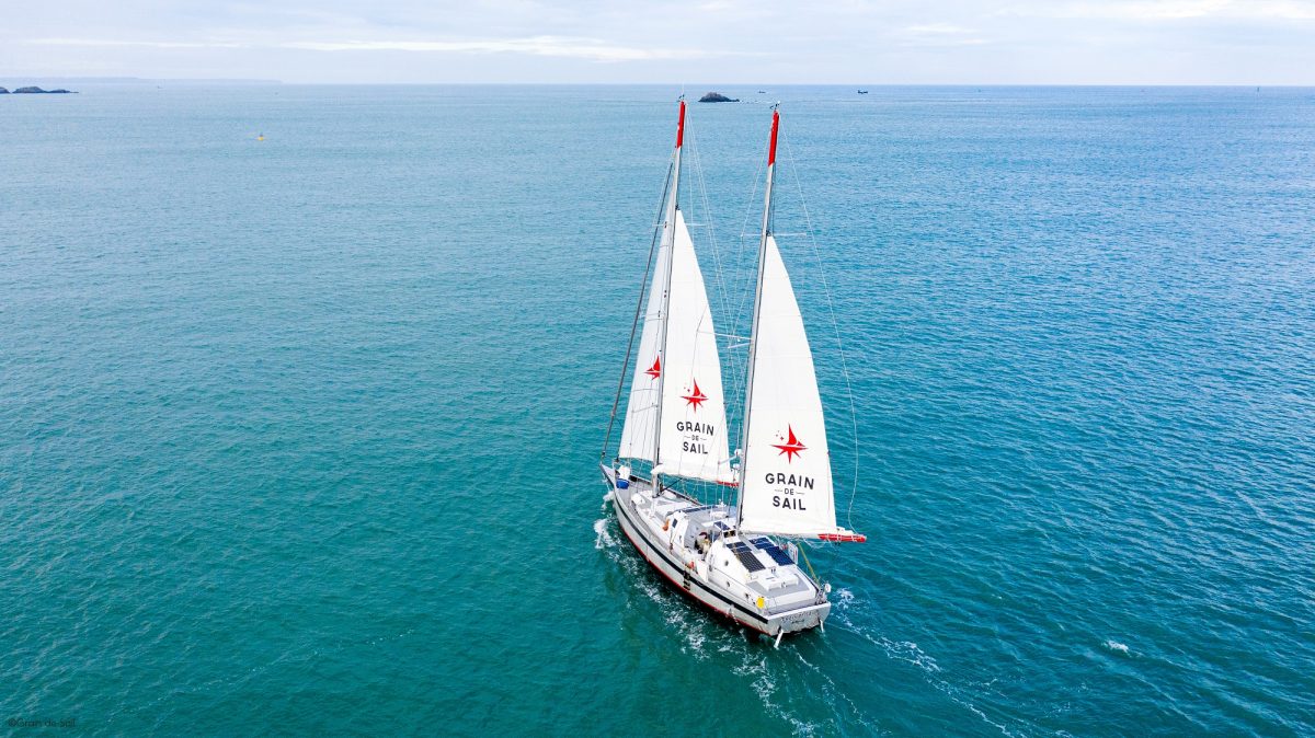 Grain de Sail, c’est un monocoque en aluminium de 24 mètres de long, gréé de 2 mâts de 24,15 mètres de haut portant jusqu’à 520 m2 de voilure. La cale, réfrigérée par des énergies vertes, peut accueillir 50 tonnes de chargement. Quatre marins sont nécessaires pour manœuvrer le navire.