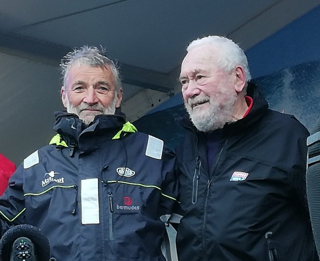 Sur son bateau, Jean-Luc Van Den Heede est salué par Sir Robin Knox-Johnston, premier homme à avoir bouclé un tour du monde à la voile et en solitaire en 1969, et par Hugues Aufray, chanteur et ami de VDH / Photo G. R.